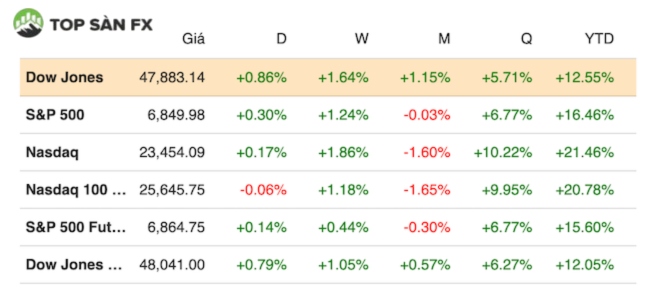 Cụ thể, đóng cửa phiên giao dịch ngày 03/12, chỉ số trung bình công nghiệp Dow Jones tăng 408.44 điểm (tương đương 0.86%) lên 47,882.90 điểm. Chỉ số S&P 500 tiến 0.30% lên 6,849.72 điểm, còn chỉ số Nasdaq Composite nhích 0.17% lên 23,454.09 điểm.
