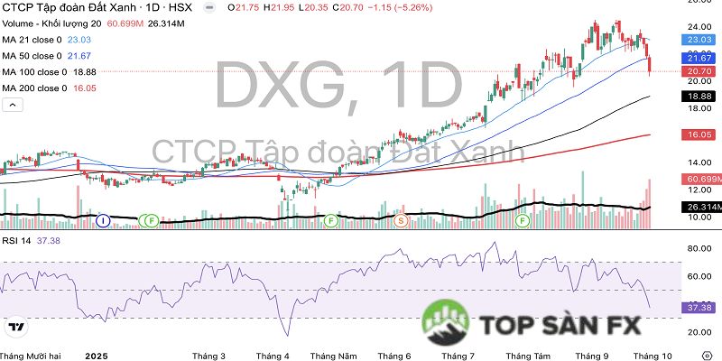 Trên thị trường, trong khoảng thời gian từ ngày 9/4 – 12/9, cổ phiếu DXG đã tăng 128,8%, từ 10.510 đồng lên 24.050 đồng/cp. Dù vậy, vài tuần trở lại đây, mã này đã chịu áp lực bán, khiến đến ngày 30/9 chỉ còn được giao dịch ở vùng 20.700 đồng/cp, thấp hơn 13,9% so với mức đỉnh ghi nhận hôm 12/9.
