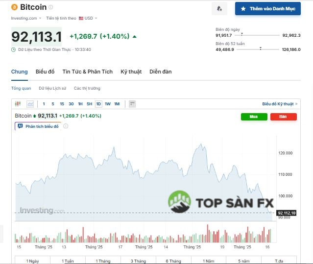 Dữ liệu từ sàn giao dịch Binance cho thấy, mở cửa phiên giao dịch 19/11, giá BTC bất ngờ tăng vọt từ vùng giá 90.000 USD vào cuối ngày hôm qua lên 93.000 USD. Đến 7 giờ cùng ngày, mỗi Bitcoin (BTC) được giao dịch quanh mốc 92.000 USD, tăng khoảng 1% trong vòng 24 giờ qua.