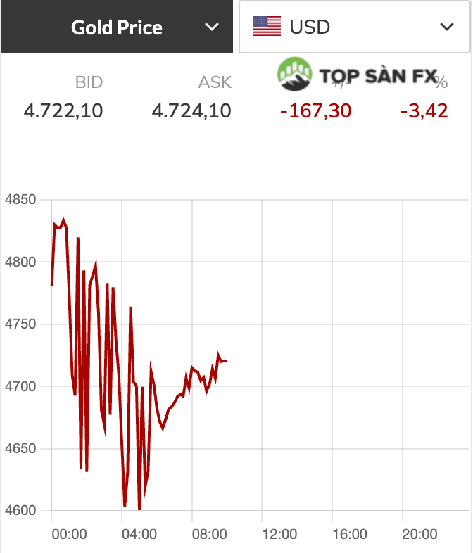 Theo đó, ghi nhận vào lúc 9h sáng hôm nay, thị trường vàng quốc tế đang giao dịch quanh ngưỡng 4.733,8 USD/oz. Như vậy, so với giá chốt phiên cuối tuần trước ở mức 4.889,4 USD/oz, kim loại quý này đã bốc hơi khoảng 155,6 USD/oz (tương đương với khoảng 4,9 triệu đồng/lượng).