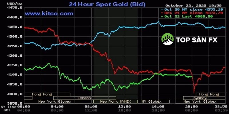 Cụ thể, kết thúc phiên giao dịch hôm thứ Tư (22/10), giá vàng thế giới giao ngay giảm 26 USD/oz xuống còn 4.097 USD. Đây là mức thấp nhất kể từ phiên 10/10 của kim loại quý. Trước đó, thị trường ghi nhận phiên 21/10 giảm mạnh nhất 5 năm, do nhà đầu tư chốt lời sau chuỗi tăng kỷ lục.