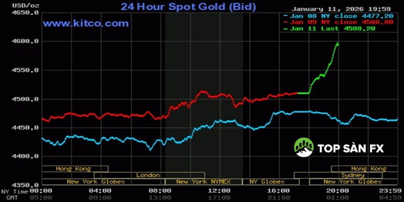 Tại phiên giao dịch hôm nay ngày 12/01/2026, giá vàng thế giới đang hướng tới mốc 4.600 USD do bất ổn địa chính trị và báo cáo việc làm tuần trước của Mỹ.