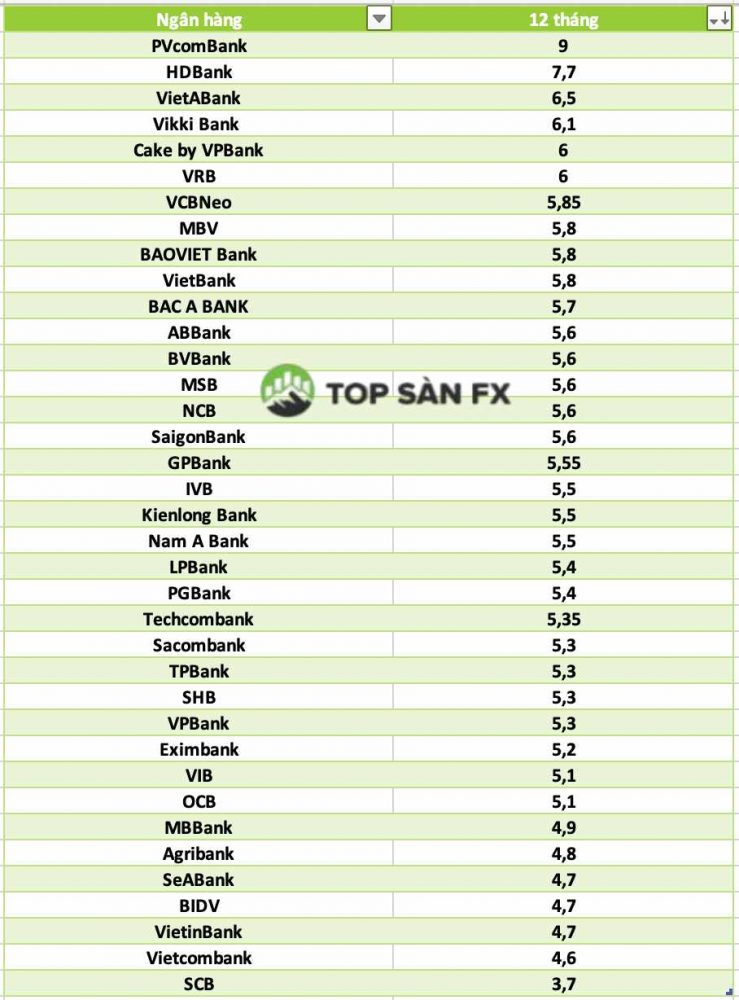Lãi suất gửi tiết kiệm tại các ngân hàng kỳ hạn 12 tháng