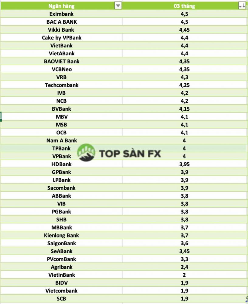 Lãi suất gửi tiết kiệm tại các ngân hàng kỳ hạn 3 tháng: