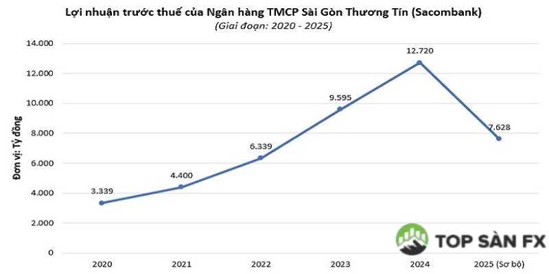 Ngân hàng TMCP Sài Gòn Thương Tín (Sacombank, STB) ước lãi trước thuế 7.628 tỷ đồng năm 2025. So với cùng kỳ năm trước, con số này đã giảm 40% và chỉ đạt 52% kế hoạch, do chi phí trích lập dự phòng tăng cao trong quý IV/2025.