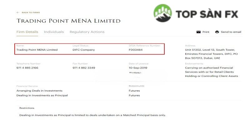 - Trading Point MENA Ltd, cấp bởi DFSA – Cơ quan Dịch vụ Tài chính Dubai, số giấy phép F003484.
