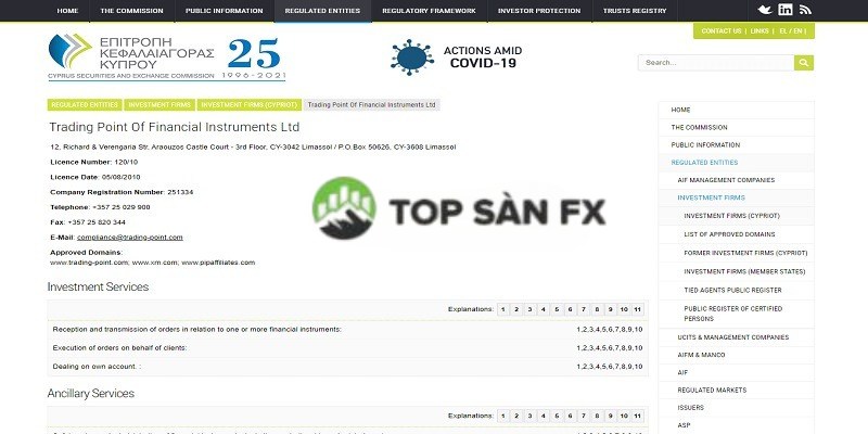 - Trading Point of Financial Instruments Limited, cấp bởi CySEC – Ủy ban Chứng khoán & Giao dịch Síp, số giấy phép 120/10.
