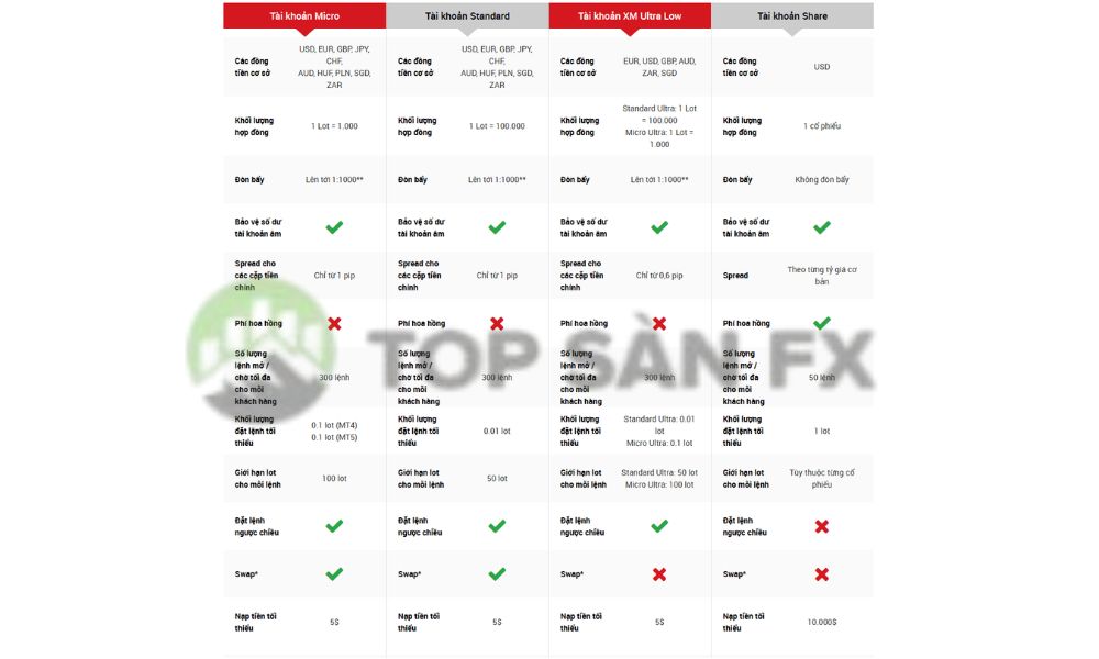 XM cung cấp nhiều loại tài khoản khác nhau để phù hợp với nhu cầu của trader từ mới bắt đầu cho đến chuyên nghiệp. Theo đó, sàn này hiện đang cung cấp 4 loại tài khoản chính sau:
